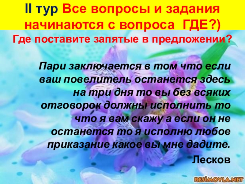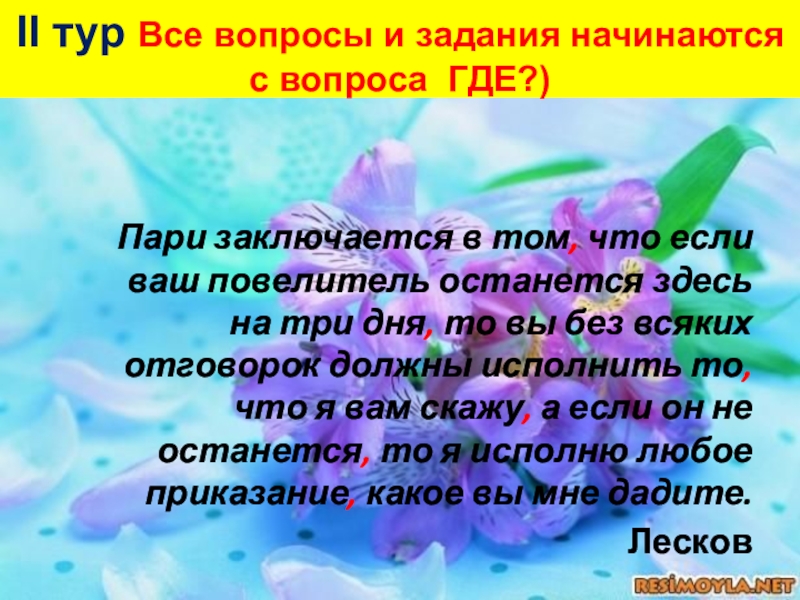 Пари заключается в том что если ваш повелитель останется здесь на три дня то вы без всяких отговорок должны исполнить то что я вам скажу а если он не останется то я исполню любое приказание какое вы мне дадите.