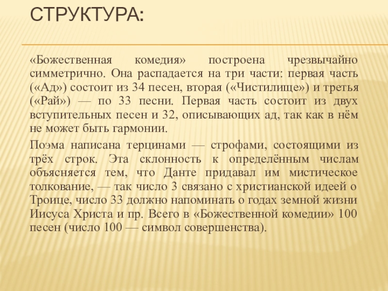 «Божественная комедия» построена чрезвычайно симметрично. Она распадается на три части: первая