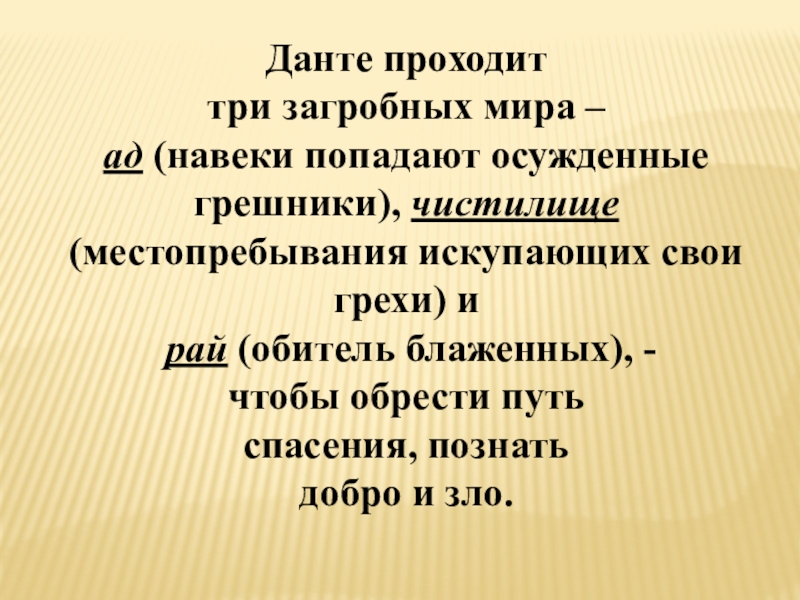 мая\июнь 1265 — 13 или 14 сентября 1321) — итальянский поэт, один из основоположников литературного итальянского языка. Создатель «Комедии» (позднее получившей эпитет «Божественной», введённый Боккаччо), в которой был дан синтез позднесредневековой культуры.