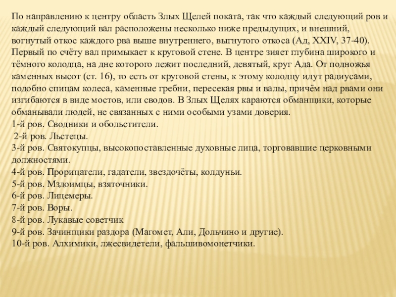 • 8-й круг. Обманувшие недоверившихся. Состоит из десяти рвов (Злопазухи, или Злые Щели), которые отделены друг от друга валами (перекатами).).
