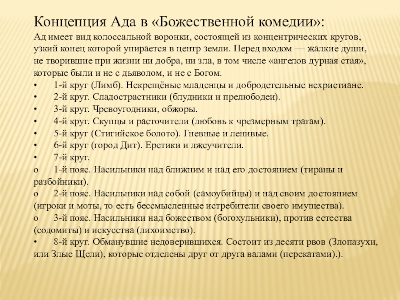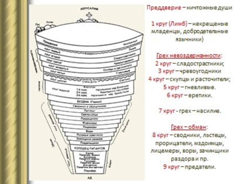 концентрических кругов, узкий конец которой упирается в центр земли. Перед входом — жалкие души, не творившие при жизни ни добра, ни зла, в том числе «ангелов дурная стая», которые были и не с дьяволом, и не с Богом.