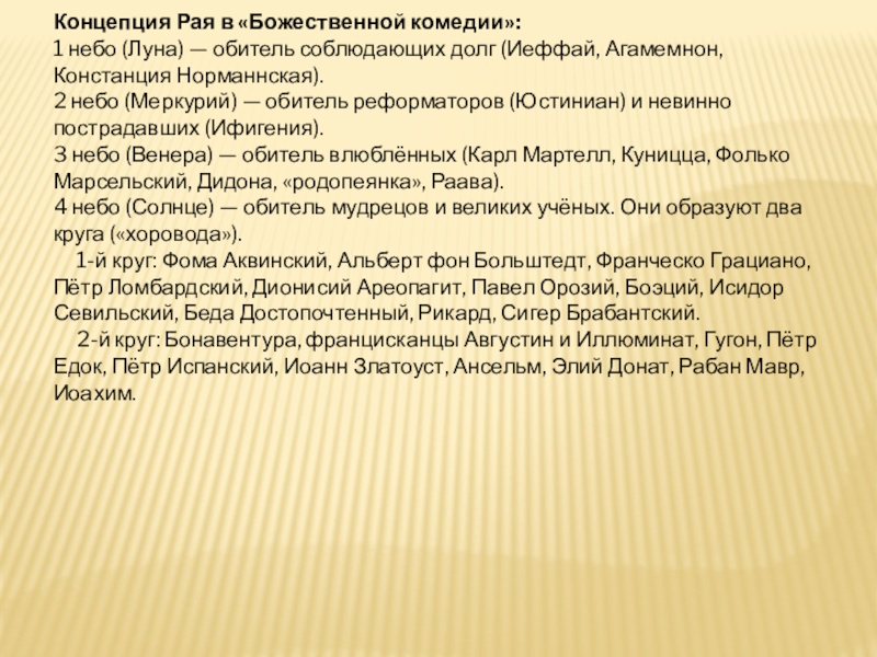 6 небо (Юпитер) — обитель справедливых правителей (библейские цари Давид и Езекия, император Траян, король Гульельмо II Добрый и герой «Энеиды» Рифей).