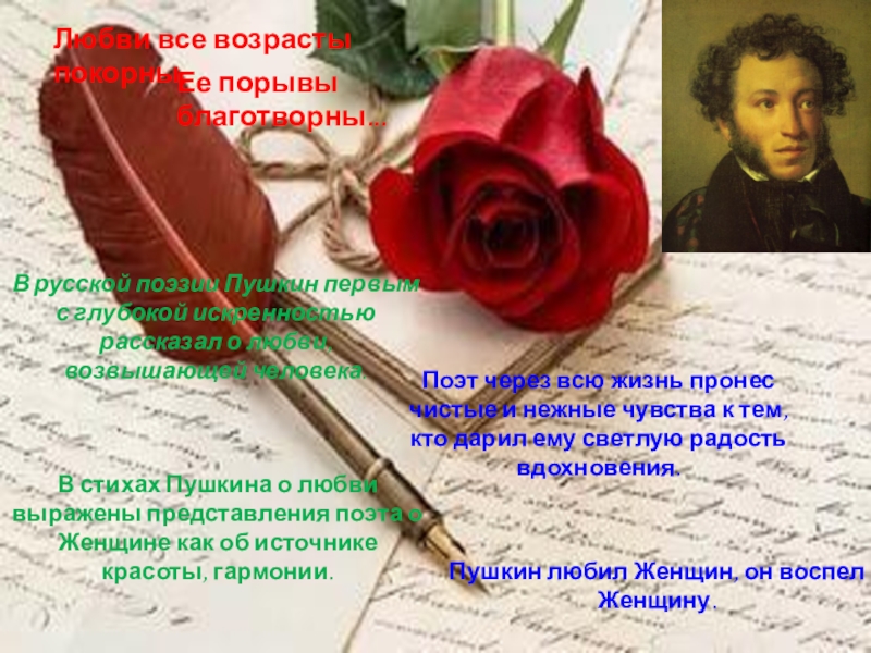 В стихах Пушкина о любви выражены представления поэта о Женщине как об источнике красоты, гармонии.
