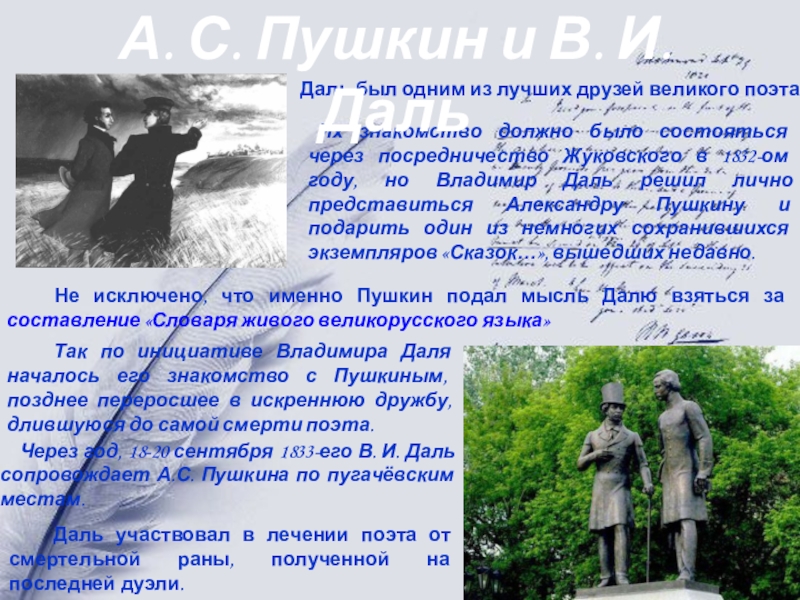 Так по инициативе Владимира Даля началось его знакомство с Пушкиным, позднее переросшее в искреннюю дружбу, длившуюся до самой смерти поэта.