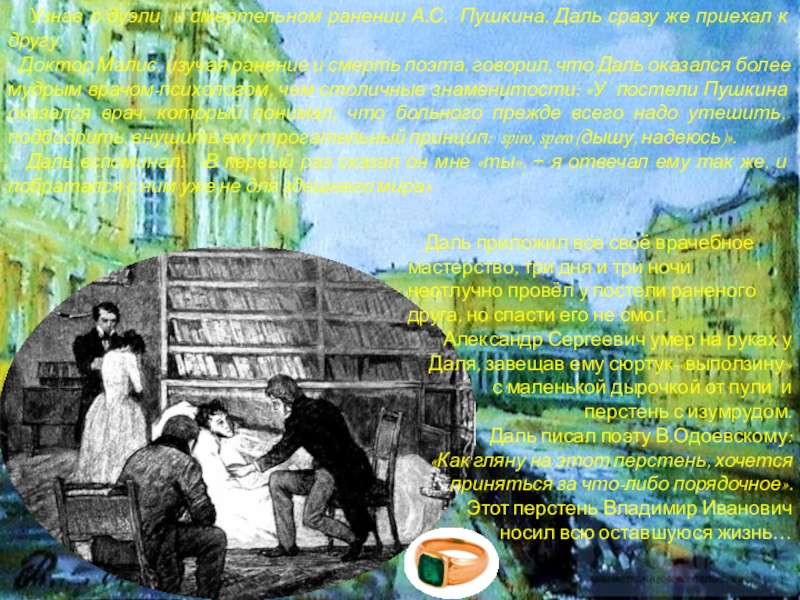 Даль участвовал в лечении поэта от смертельной раны, полученной на последней дуэли.