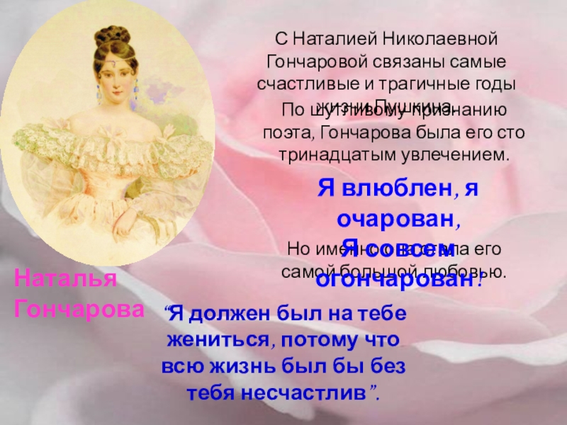По шутливому признанию поэта, Гончарова была его сто тринадцатым увлечением.