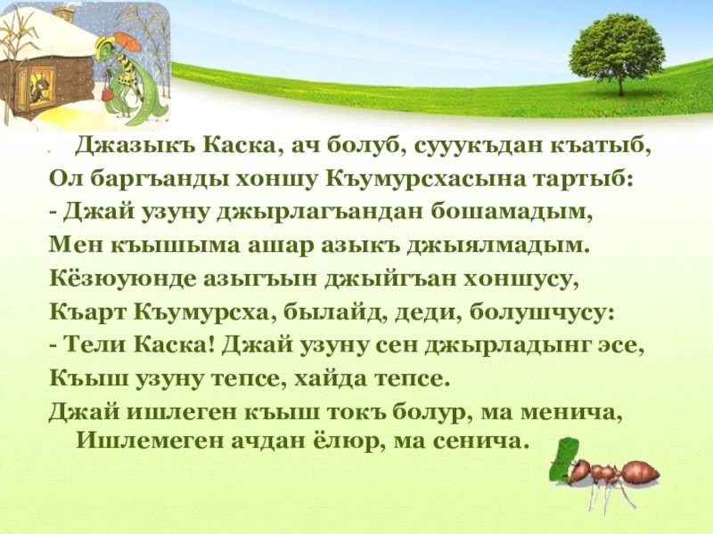 Джазыкъ Каска, ач болуб, сууукъдан къатыб,Ол баргъанды хоншу Къумурсхасына тартыб:- Джай узуну джырлагъандан бошамадым,Мен къышыма ашар азыкъ