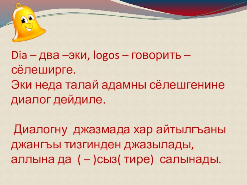 Dia – два –эки, logos – говорить – сёлеширге. Эки неда талай адамны сёлешгенине диалог дейдиле. Диалогну