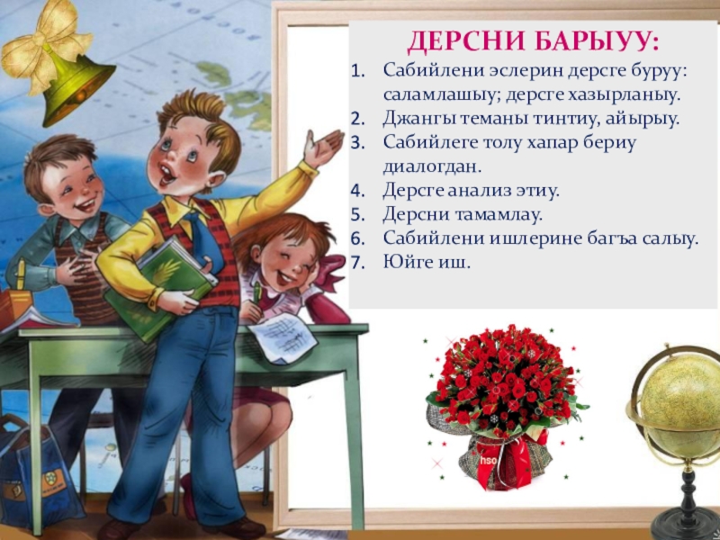 ДЕРСНИ БАРЫУУ: Сабийлени эслерин дерсге буруу: саламлашыу; дерсге хазырланыу.Джангы теманы тинтиу, айырыу.Сабийлеге толу хапар бериу диалогдан.Дерсге анализ