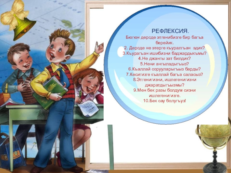 РЕФЛЕКСИЯ. Бюгюн дерсде этгенибизге бир багъа берейик.2. Дерсде не этерге къуралгъан эдик?3.Къурагъан ишибизни баджардыкъмы?4.Не джангы зат билдик?5.Нени