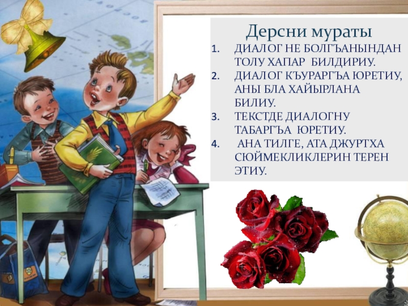 Дерсни мураты ДИАЛОГ НЕ БОЛГЪАНЫНДАН ТОЛУ ХАПАР БИЛДИРИУ.ДИАЛОГ КЪУРАРГЪА ЮРЕТИУ, АНЫ БЛА ХАЙЫРЛАНА БИЛИУ.ТЕКСТДЕ ДИАЛОГНУ ТАБАРГЪА ЮРЕТИУ. АНА ТИЛГЕ, АТА ДЖУРТХА СЮЙМЕКЛИКЛЕРИН ТЕРЕН ЭТИУ.