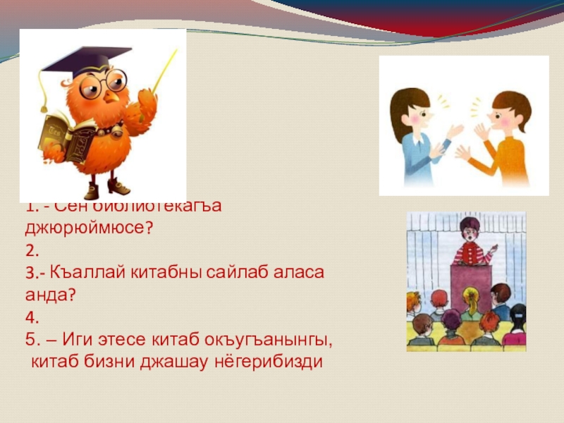 1. - Сен библиотекагъа джюрюймюсе?2.3.- Къаллай китабны сайлаб аласа анда?4.5. – Иги этесе китаб окъугъанынгы, китаб бизни