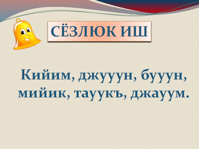 СЁЗЛЮК ИШКийим, джууун, бууун, мийик, тауукъ, джауум.