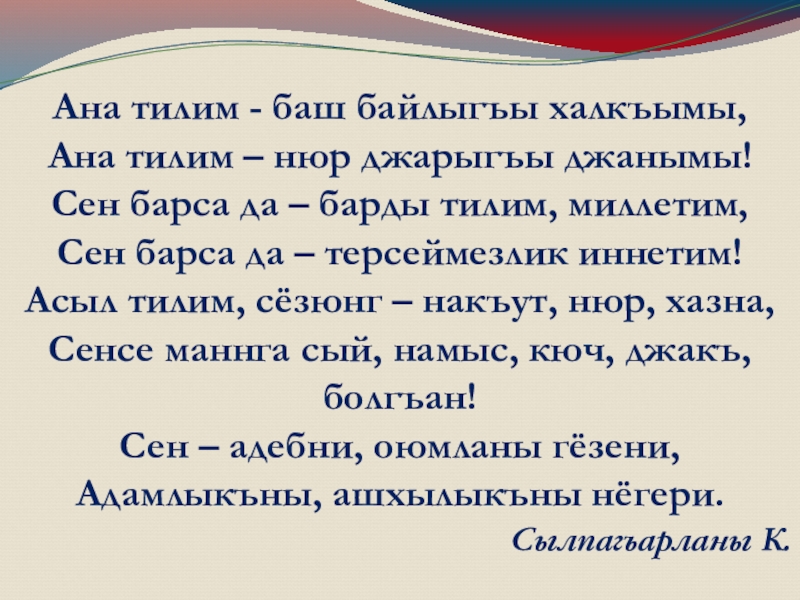 Ана тилим - баш байлыгъы халкъымы, Ана тилим – нюр джарыгъы джанымы!Сен барса да – барды тилим,