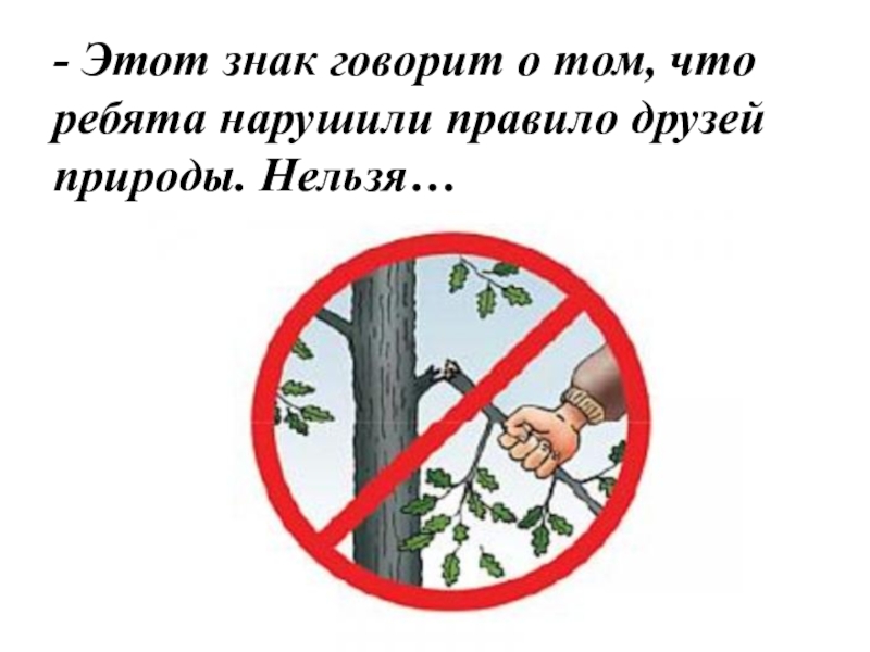 - Этот знак говорит о том, что ребята нарушили правило друзей природы. Нельзя…