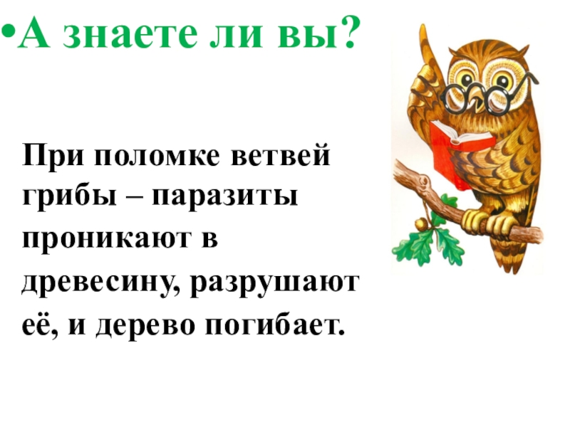 А знаете ли вы?При поломке ветвей грибы – паразитыпроникают вдревесину, разрушаютеё, и дерево погибает.