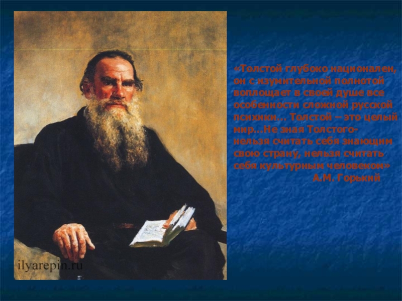 все особенности сложной русской психики… Толстой – это целый мир…Не зная Толстого- нельзя считать себя знающим свою страну, нельзя считать себя культурным человеком»