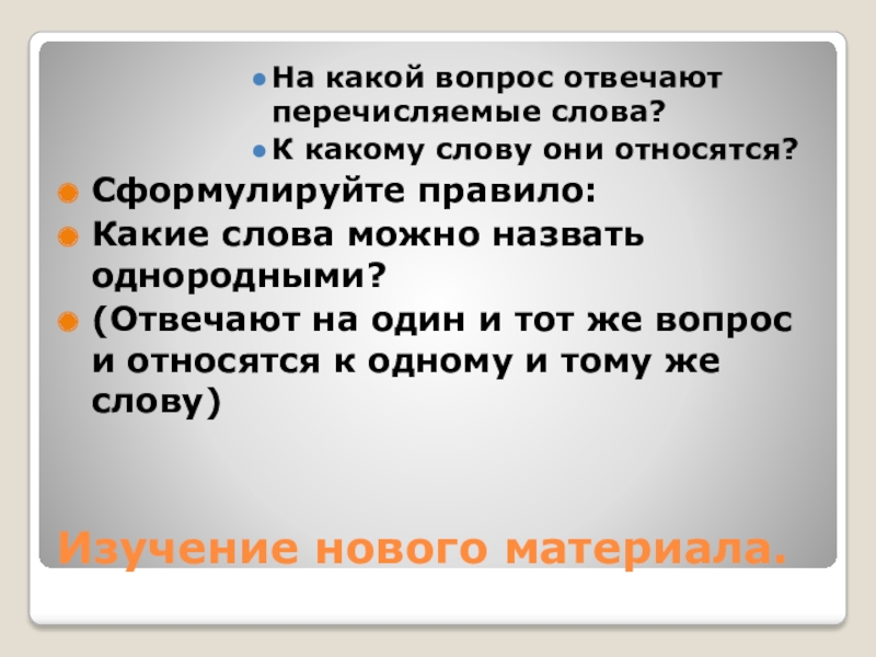 Изучение нового материала.На какой вопрос отвечают перечисляемые слова?К какому слову они относятся?Сформулируйте правило:Какие слова можно назвать однородными?(Отвечают