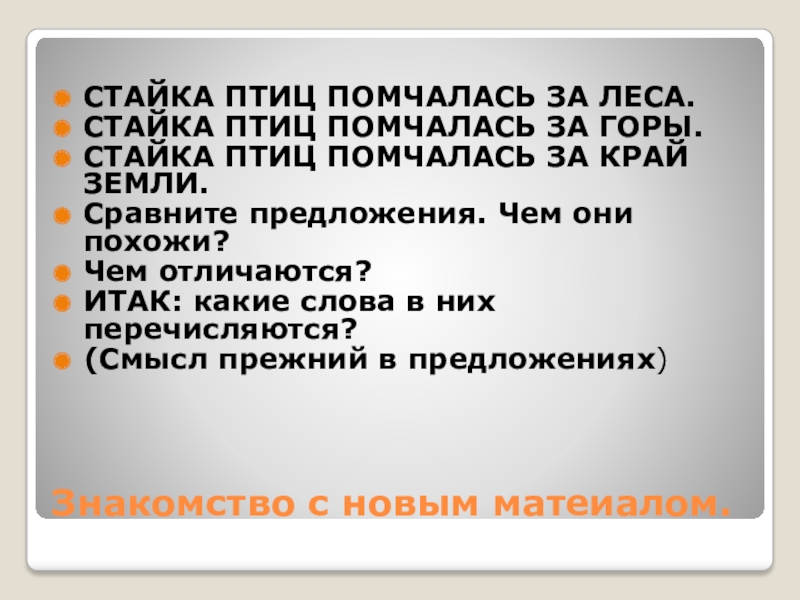 Знакомство с новым матеиалом.СТАЙКА ПТИЦ ПОМЧАЛАСЬ ЗА ЛЕСА.СТАЙКА ПТИЦ ПОМЧАЛАСЬ ЗА ГОРЫ.СТАЙКА ПТИЦ ПОМЧАЛАСЬ ЗА КРАЙ ЗЕМЛИ.Сравните