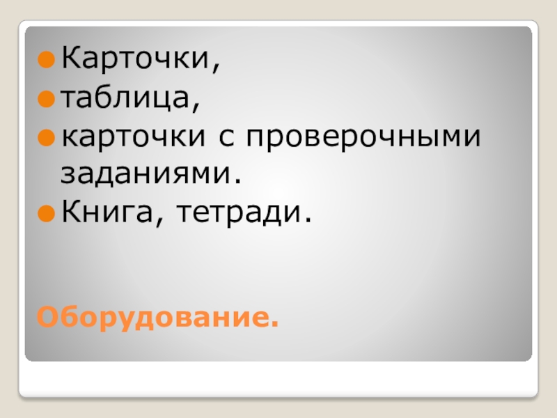 Оборудование.Карточки,  таблица,  карточки с проверочными заданиями. Книга, тетради.