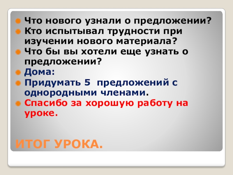 ИТОГ УРОКА.Что нового узнали о предложении?Кто испытывал трудности при изучении нового материала?Что бы вы хотели еще узнать