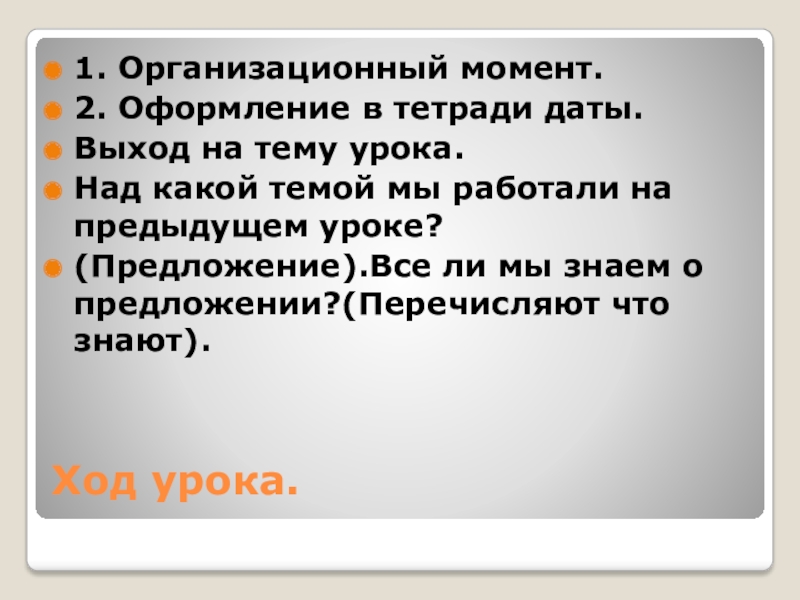 Ход урока.1. Организационный момент.2. Оформление в тетради даты.Выход на тему урока.Над какой темой мы работали на предыдущем