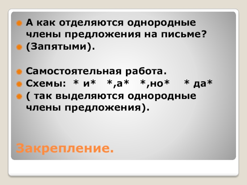 Закрепление.А как отделяются однородные члены предложения на письме?(Запятыми).Самостоятельная работа.Схемы: * и*  *,а*  *,но*  *