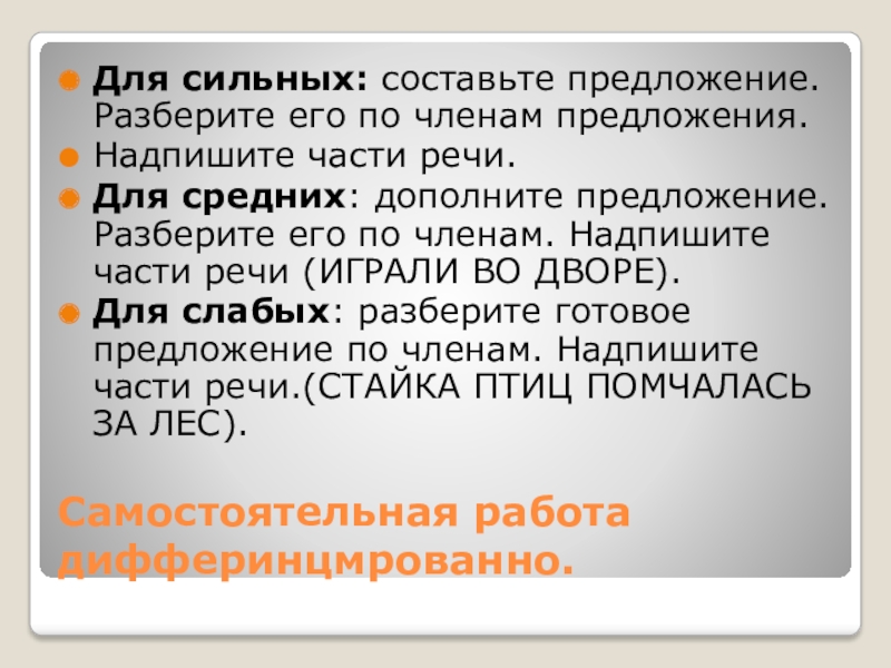Самостоятельная работа дифферинцмрованно.Для сильных: составьте предложение. Разберите его по членам предложения.Надпишите части речи.Для средних: дополните предложение. Разберите