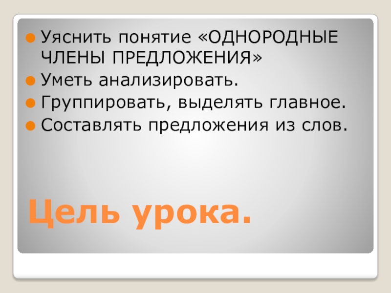 Цель урока.Уяснить понятие «ОДНОРОДНЫЕ ЧЛЕНЫ ПРЕДЛОЖЕНИЯ»Уметь анализировать.Группировать, выделять главное.Составлять предложения из слов.