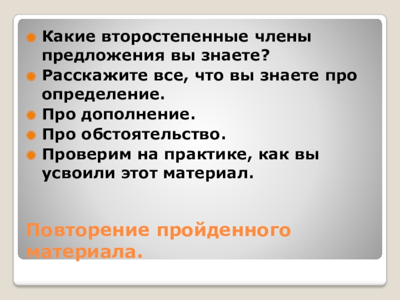 Повторение пройденного материала.Какие второстепенные члены предложения вы знаете?Расскажите все, что вы знаете про определение.Про дополнение.Про обстоятельство.Проверим на