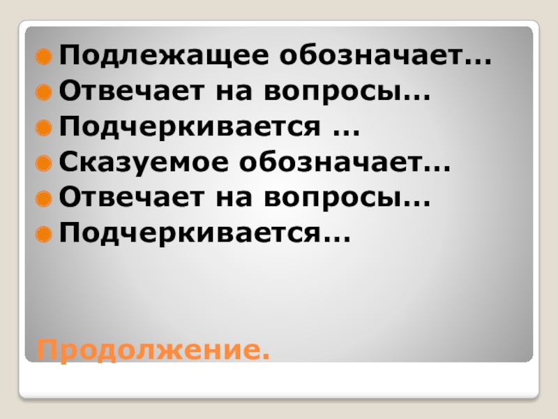 Продолжение.Подлежащее обозначает…Отвечает на вопросы…Подчеркивается …Сказуемое обозначает…Отвечает на вопросы…Подчеркивается…