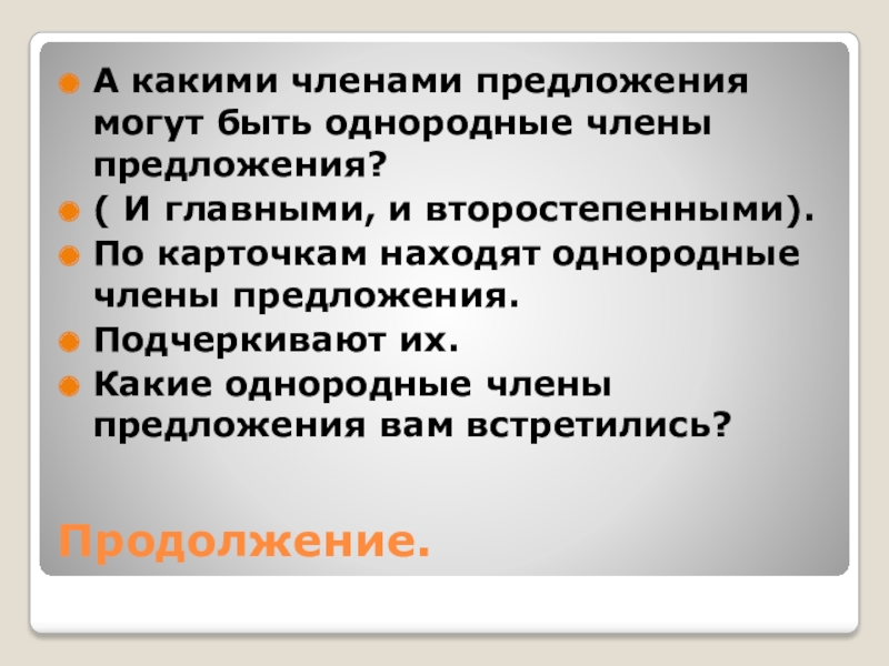 Продолжение.А какими членами предложения могут быть однородные члены предложения?( И главными, и второстепенными).По карточкам находят однородные члены