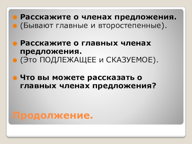 Продолжение.Расскажите о членах предложения.(Бывают главные и второстепенные).Расскажите о главных членах предложения.(Это ПОДЛЕЖАЩЕЕ и СКАЗУЕМОЕ).Что вы можете рассказать