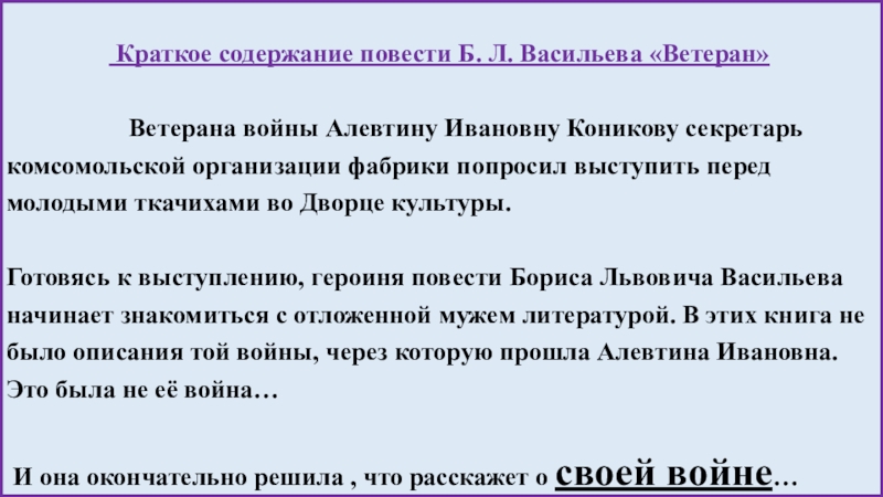 4.О чём беседовал секретарь комсомольской организации фабрики с Алевтиной Ивановной?(напомнил о том, что героиня является ветераном войны, и предложил ей выступить на следующий день перед работницами фабрики).