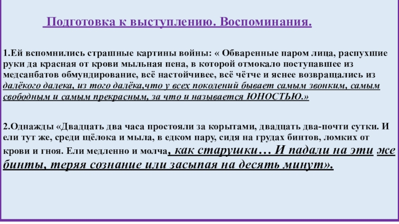 2.Однажды «Двадцать два часа простояли за корытами, двадцать два-почти сутки. И ели тут же, среди щёлока и мыла, в едком пару, сидя на грудах бинтов, ломких от крови и гноя. Ели медленно и молча, как старушки… И падали на эти же бинты, теряя сознание или засыпая на десять минут».