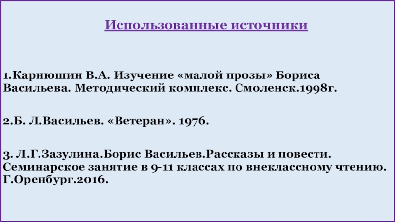 3. Л.Г.Зазулина.Борис Васильев.Рассказы и повести. Семинарское занятие в 9-11 классах по внеклассному чтению.Г.Оренбург.2016.