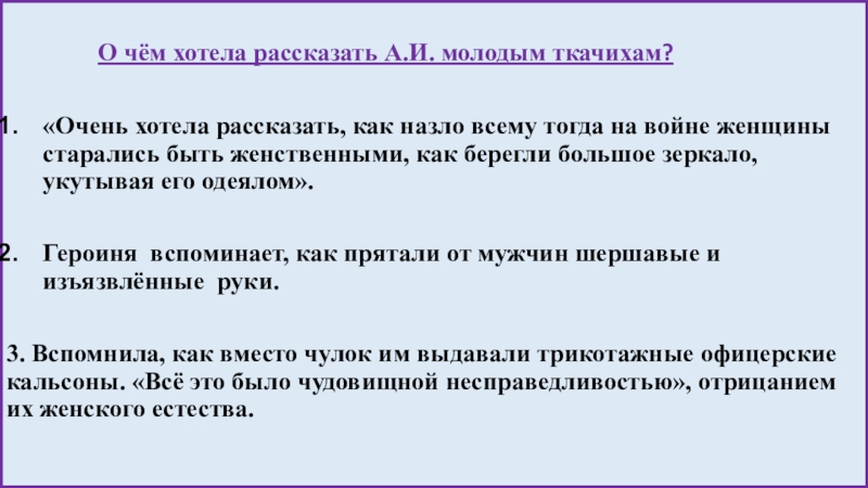 3. Вспомнила, как вместо чулок им выдавали трикотажные офицерские кальсоны. «Всё это было чудовищной несправедливостью», отрицанием их женского естества.
