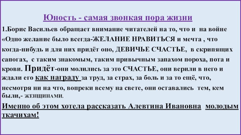 Рассказывая о том, как Алевтина Ивановна, готовясь к выступлению перед молодыми