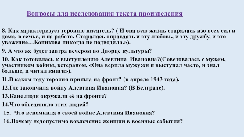 10. Как готовилась к выступлению Алевтина Ивановна?(Советовалась с мужем, участником войны, ветераном, «Она верила мужу:он и выступал часто, и знал больше, и читал книги»).