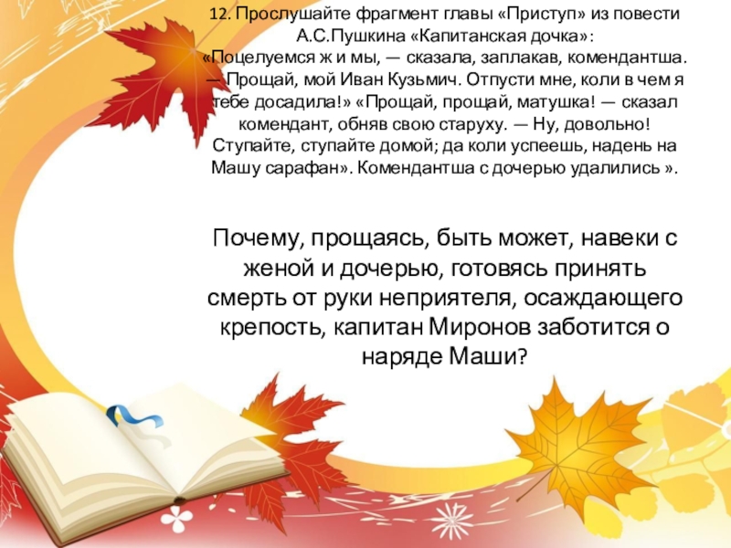 Слайд 1312. Прослушайте фрагмент главы «Приступ» из повести А.С.Пушкина «Капитанская дочка»:
