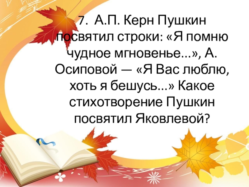 Слайд 87. А.П. Керн Пушкин посвятил строки: «Я помню чудное мгновенье...», А.