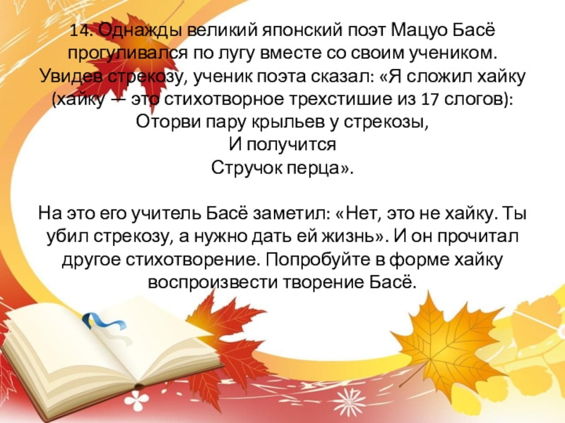 14. Однажды великий японский поэт Мацуо Басё прогуливался по лугу вместе