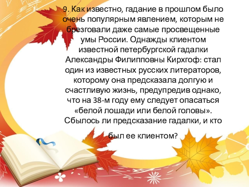 не брезговали даже самые просвещенные умы России. Однажды клиентом известной петербургской гадалки Александры Филипповны Кирхгоф: стал один из известных русских литераторов, которому она предсказала долгую и счастливую жизнь, предупредив однако, что на 38-м году ему следует опасаться «белой лошади или белой головы». Сбылось ли предсказание гадалки, и кто был ее клиентом?