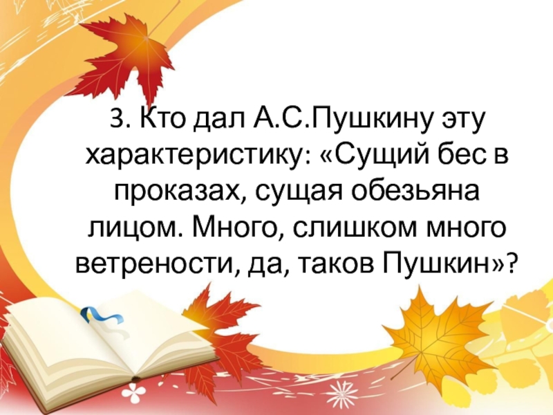 Слайд 43. Кто дал А.С.Пушкину эту характеристику: «Сущий бес в проказах, сущая