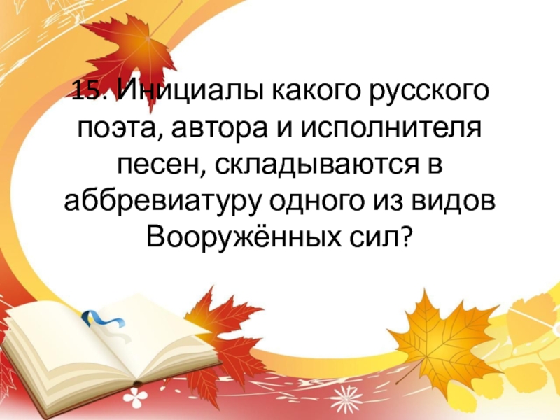 15. Инициалы какого русского поэта, автора и исполнителя песен, складываются в