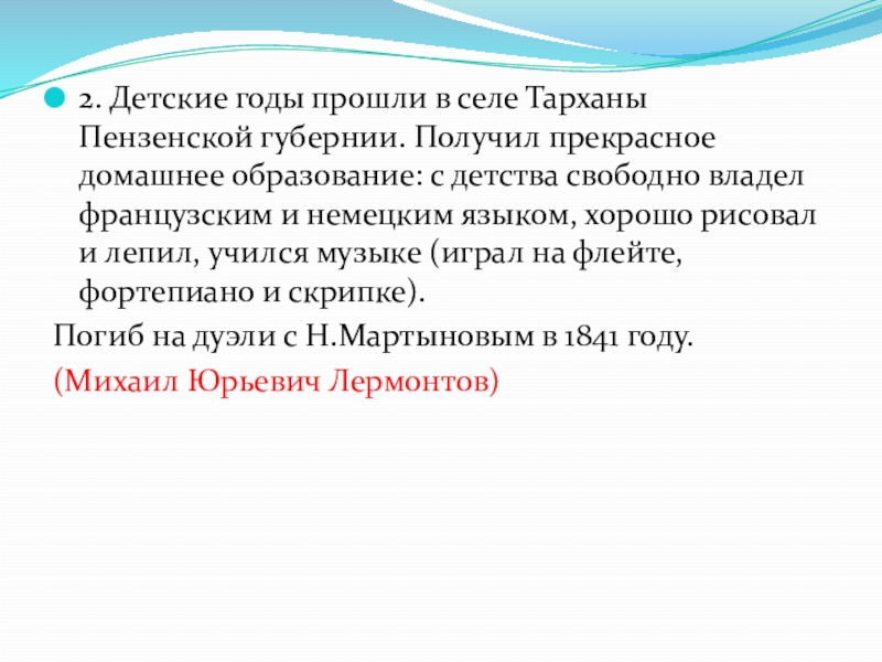 Слайд 202. Детские годы прошли в селе Тарханы Пензенской губернии. Получил прекрасное