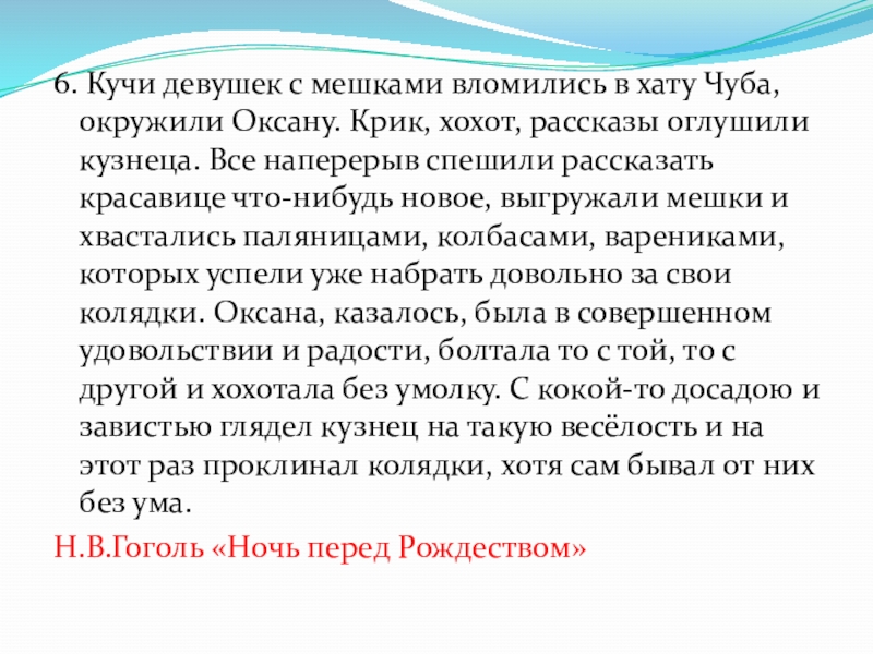 Крик, хохот, рассказы оглушили кузнеца. Все наперерыв спешили рассказать красавице что-нибудь новое, выгружали мешки и хвастались паляницами, колбасами, варениками, которых успели уже набрать довольно за свои колядки. Оксана, казалось, была в совершенном удовольствии и радости, болтала то с той, то с другой и хохотала без умолку. С кокой-то досадою и завистью глядел кузнец на такую весёлость и на этот раз проклинал колядки, хотя сам бывал от них без ума.