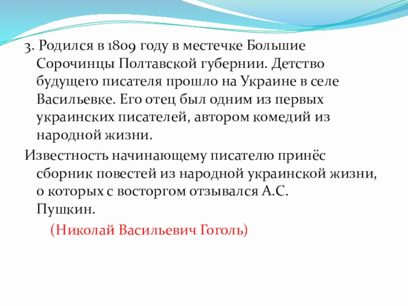 Слайд 213. Родился в 1809 году в местечке Большие Сорочинцы Полтавской губернии.