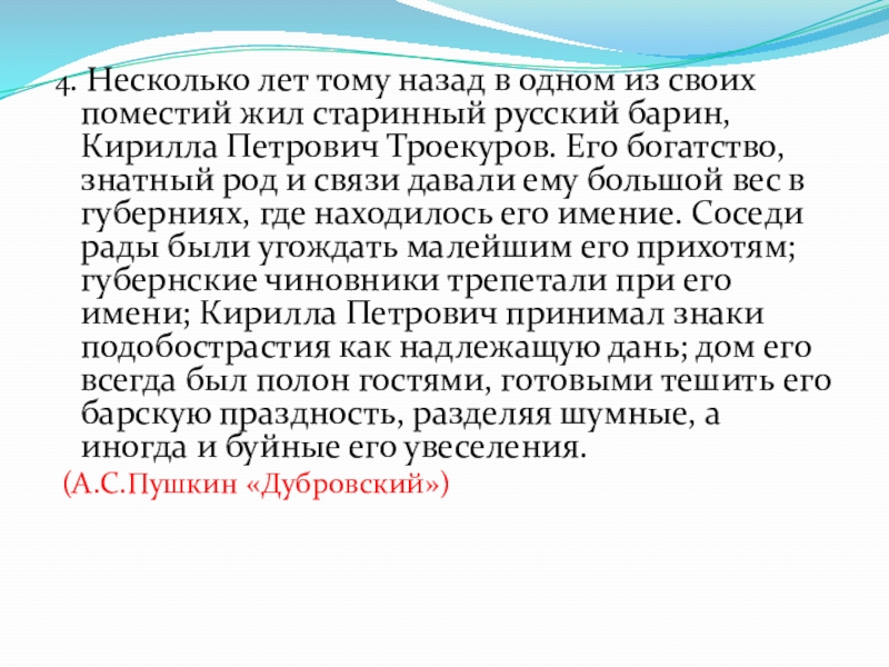 старинный русский барин, Кирилла Петрович Троекуров. Его богатство, знатный род и связи давали ему большой вес в губерниях, где находилось его имение. Соседи рады были угождать малейшим его прихотям; губернские чиновники трепетали при его имени; Кирилла Петрович принимал знаки подобострастия как надлежащую дань; дом его всегда был полон гостями, готовыми тешить его барскую праздность, разделяя шумные, а иногда и буйные его увеселения.