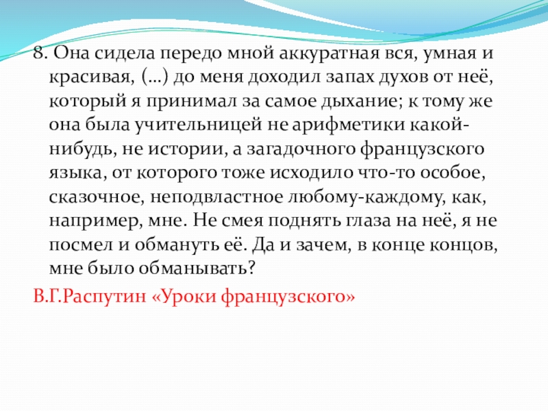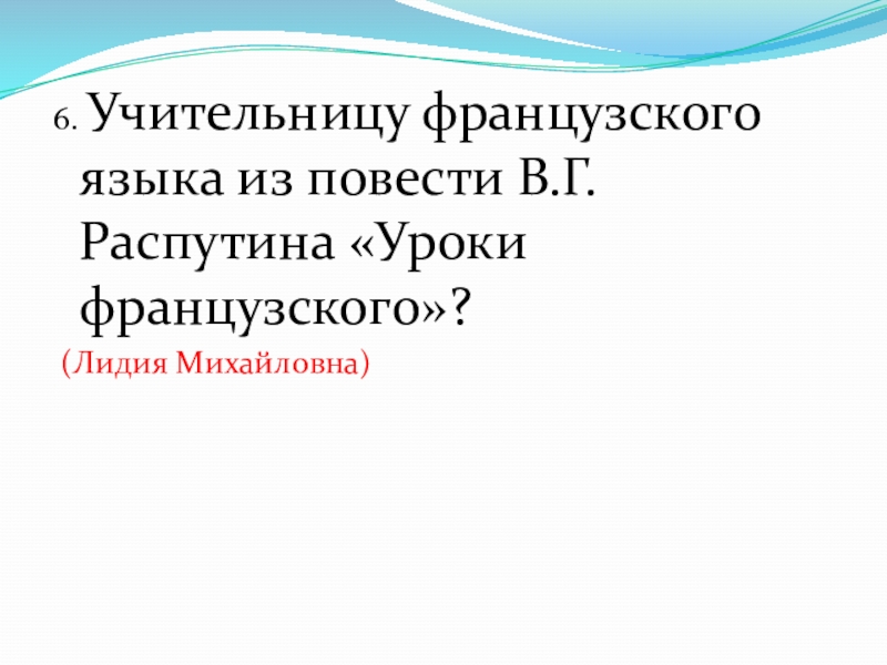 Слайд 316. Учительницу французского языка из повести В.Г.Распутина «Уроки французского»?